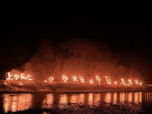 小沢田の万灯火は、道の駅かみこあに側の小阿仁川・堤防で見られます。